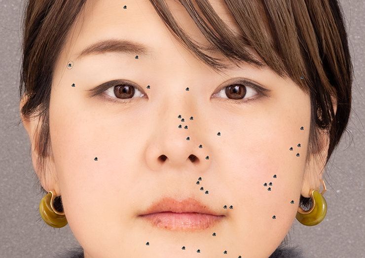 これで顔まわりの補正が完了しました(図33)(図34)。全体で見てみると、顔だけが補正されていて少し違和感がありますよね。そこで、背景や洋服も補正して統一感を出していきましょう。