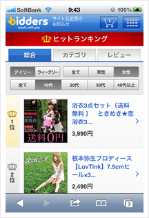 また、ビッダーズのフロントエンド開発においては、PC、スマートフォンともにjQueryを採用しているが、スマートフォン向けにはさらにjQuery MobileおよびlocalStorageを利用し、スマートフォンに特化したUIデザインとユーザビリティを提供している。