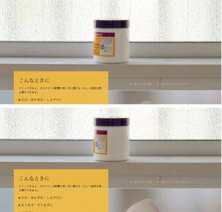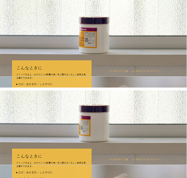 前出の「オロナイン公式サイト」(www.otsuka.co.jp/ohn/)では、画面を縦スクロールするにつれ、製品写真が回転するなどのパララックス効果を実装。オーディエンスにスクロールする楽しみを演出している。