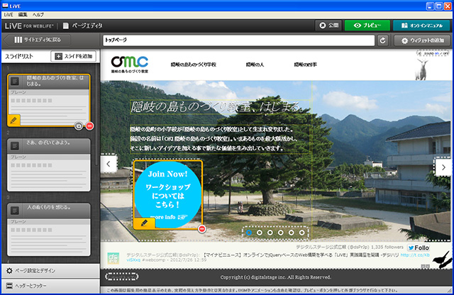 デジタルステージが販売する「LiVE for WebLiFE*」(ライブ・フォー・ウェブライフ)は、最新のHTML5+CSS3+jQueryによるWebサイトをHTMLやJavaScriptなどのコーディングを一切することなく構築できるソフトウエア。高品位かつ豊富なテンプレートを利用でき、Webブラウザいっぱいに表示されるフルスクリーンタイプのWebサイトに、さまざまなページ切替効果やパララックスなどの視覚的効果、複数のサウンドなどを簡単に追加してリッチなUI/UXを実現。プロモーションやブランディングなど「プレゼンテーション」を目的とした特設サイト制作などに最適なWebデザインツールである。
