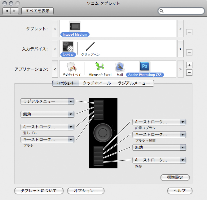 「Photoshopでショートカットキーを使って鉛筆ツールからブラシツールに切り替えるには、shift+Bキーを3回押す必要がありますが、それをIntuos4のファンクションキーに割り当てておけばワンタッチでツールを切り替えられます【図3】。メニュー操作する際は、ファンクションキーにラジアルメニューを割り当てておくと便利【図4】。IntuosシリーズはIntuos2のころからずっと使い続けていますが、Intuos4になってファンクションキーの使い勝手は格段に向上したと思います。実際、作業スピードはこれまでとは比較にならないくらいアップしました」