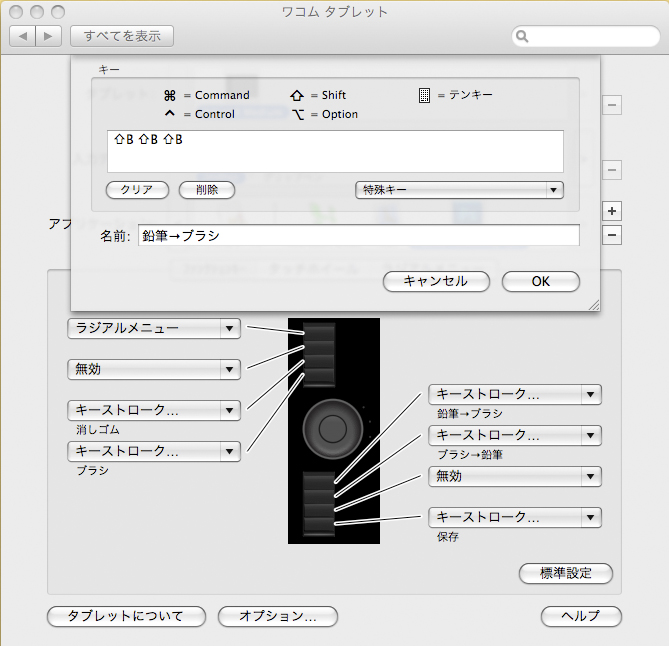 Photoshopでショートカットキーを使って鉛筆ツールからブラシツールに切り替えるには、shift+Bキーを3回押す必要がある。それを、Intuos4のファンクションキーに割り当てているところ。このように設定すると、ファンクションキーを1回押すだけですぐに鉛筆ツールからブラシツールに切り替えられるようになる