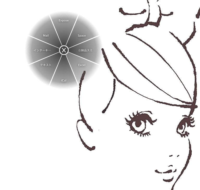 ラジアルメニューは、ファンクションキーにデフォルトで割り当てられている機能で、呼び出すと画面に放射状のメニューが表示される。表示されるメニューをペンでクリックすると、そのメニューに記された操作を実行することができる。メニューに表示する操作内容はカスタマイズ可能。蛯原さんは、よく使うソフトウエアやExpose、Spacesなどの機能を割り当てて使用しているとのこと
