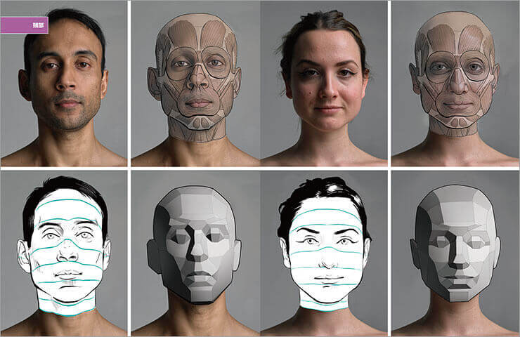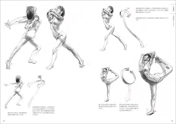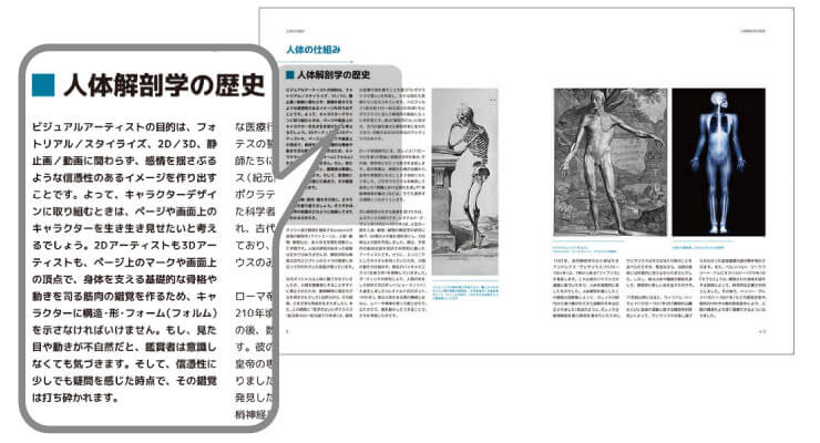 もう一つは、デッサンを卒業し、そこから自分のオリジナルの作品制作を行う時に非常に役に立つこと。例えばデフォルメをして可愛い5等身のキャラクターを作ったとしても、人間が動くうえで可能な可動域や筋肉を理解していないと、見る人は「可愛い」と感じる前に、「疑問」を感じてしまう。人体を理解していないと説得力のある作品を作ることはできないのだ。平面作品制作の他にも、3D、静止画、動画、漫画、キャラクターデザインなど、より生き生きとした信憑性のある表現を手に入れるために参考にしたい一冊だ。