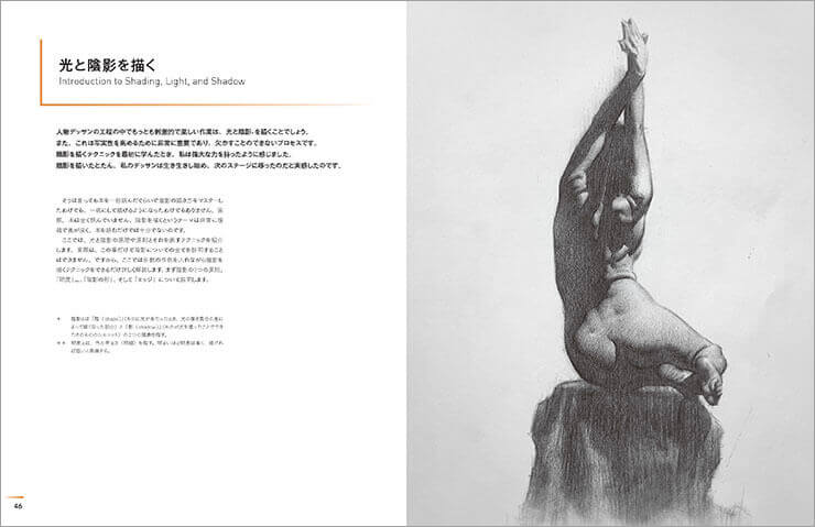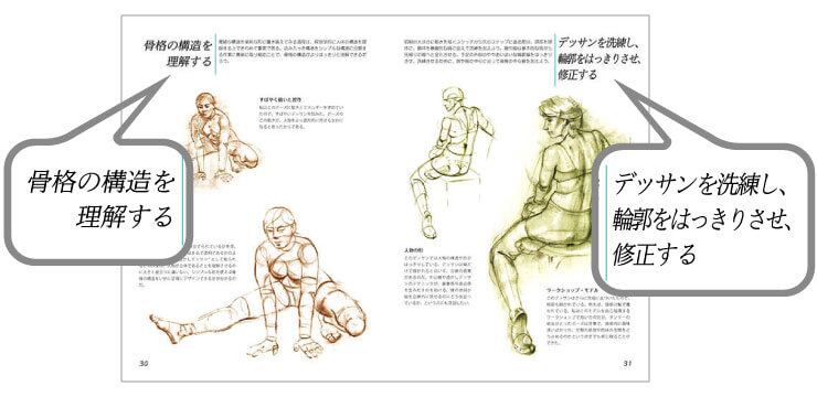 各ページの上部にテーマが書かれているのだが、この言葉がとても分かりやすく、人物を描く上で重要なヒントになっている。全文章を読まなくても、このテーマタイトルとデッサンの写真を見るだけでも非常に勉強になる構成だ。