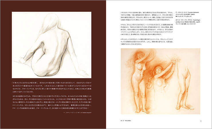 第六章「制作過程と作品化」では、デッサンを発展させ、そこからオリジナルの作品をどのように仕上げ、表現していくかも説明されている。デッサンをある程度描けるようになり「さぁこれからオリジナルの作品を作って、発表するぞ!」という人にもオススメしたい内容である。