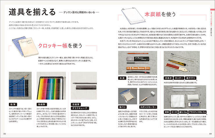 鉛筆以外にもさまざまな道具を紹介しているので、これから道具を揃えようと思っている人にも大変参考になる。また、デッサンをするにあたって、補助をしてくれる道具や紙の紹介なども分かりやすく教えている。(鉛筆の持ち方も記載されているが、この部分は自分の持ち方と違うので、参考にはなるが、少し考え方が違うかも……。)