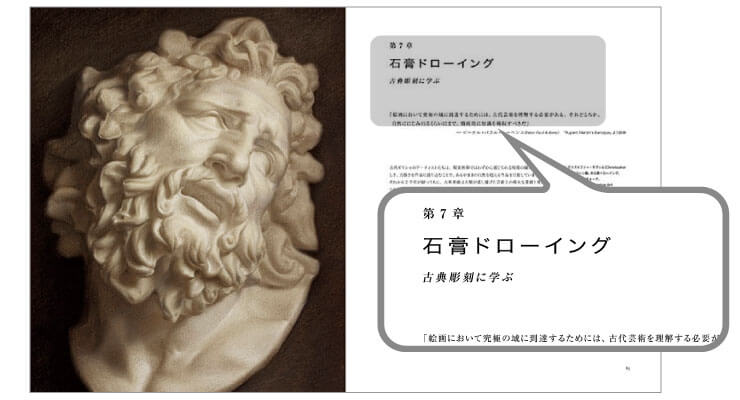長時間観察することができて、陰影が分かりやすい古典彫刻を見ながら練習すると、頭と道具が連動しやすくなり実際にモデルを見ながら描く準備を整える事ができる。この章は初心者にも読んでほしい内容だ。