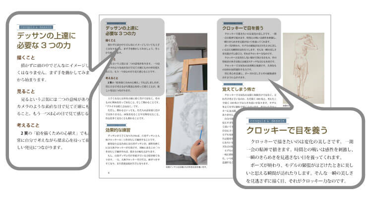 タイトル通り、「クロッキー」を重要視した構成が特徴。そこから感性を磨き、デッサン上達をめざす方法が紹介されている。45Pで紹介されている“立体的に見える理由” の説明は、自分がデッサンの授業の初回で説明するものと同じ内容だ。