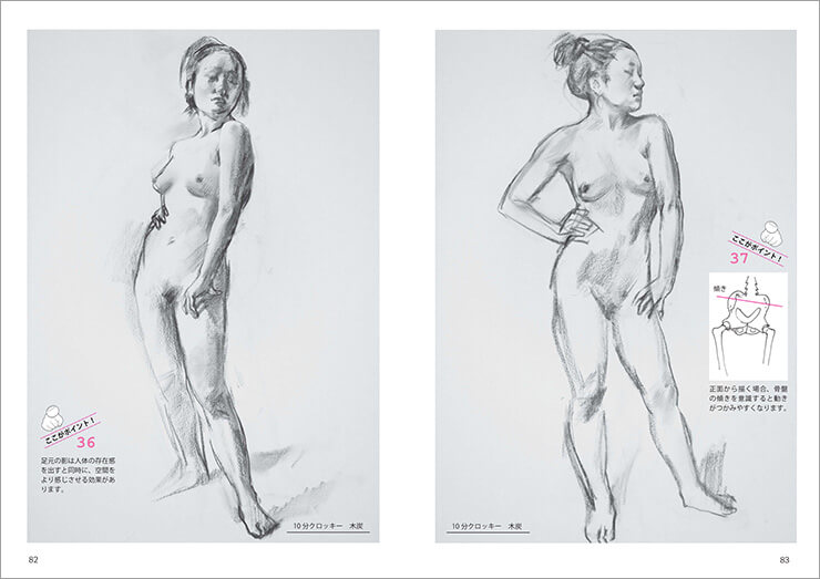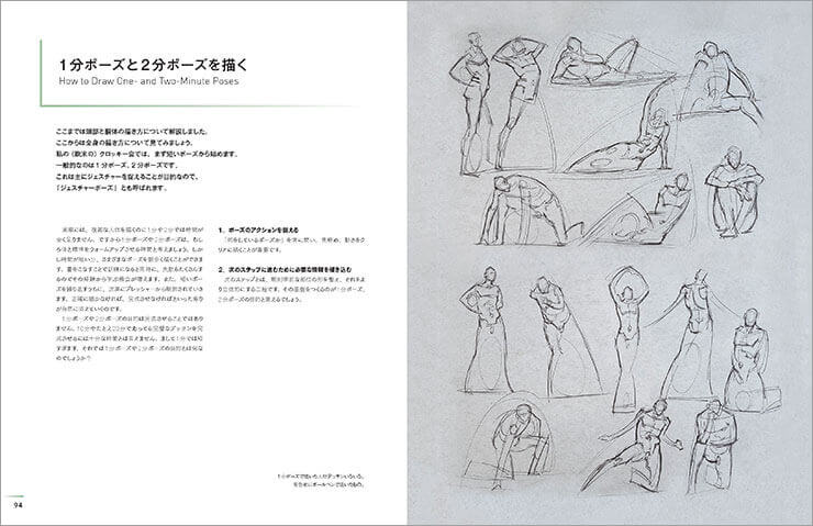 本書でも、人物デッサンをする上での「クロッキーの大切さ」を伝えている。中でも1分ポーズという短い時間で始めて、10 分、20 分と徐々に時間を長くしてクロッキーを行うプロセスがとてもおもしろいと思った。最初は失敗を恐れず手をたくさん動かして、徐々に時間を長くし、頭に考える時間を与える手法はとても効果的だと思う。