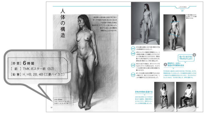 先に紹介した「イチバン親切なデッサンの教科書」が初心者向けにデッサンのノウハウを丁寧に紹介する本だとしたら、こちらはデッサンがある程度描けるようになった中級者が、より深く人物デッサンを学ぶために読んでほしい一冊だ。人物を描く上で、知っておいたほうがよい人体の解剖学的な考え方や歴史に名を残す巨匠から学ぶ方法なども紹介されており、さまざまな悩みを解決してくれる充実の内容となっている。