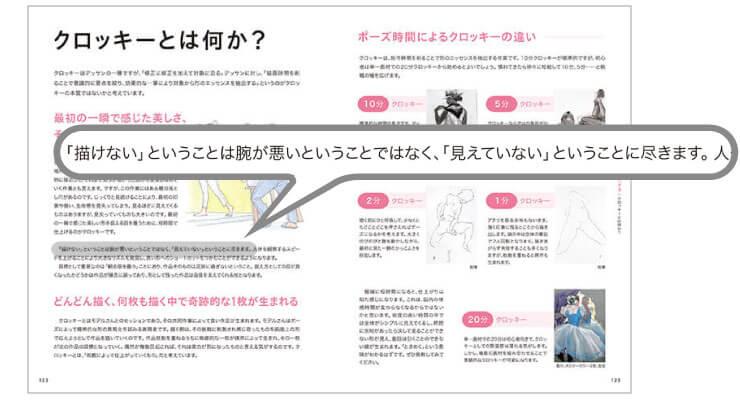 渡邉講師曰く、人物デッサン上達のために一番重要なのは「練習量」。ただ、何も考えずに描く20枚と頭を使って考えながら描く20枚とでは雲泥の差が出てくると言う。では「何を考えれば良いのか?」「クロッキーとは何なのか?」と感じた時に、これから紹介する本をめくってみると、そのヒントが随所に散りばめられている。