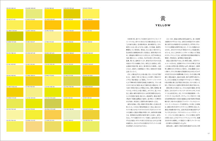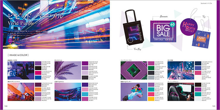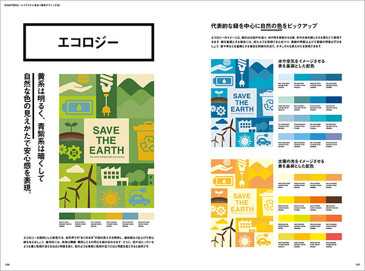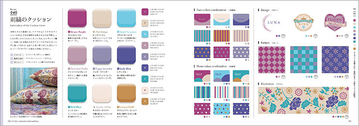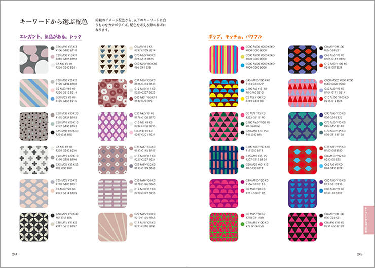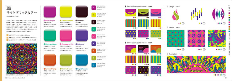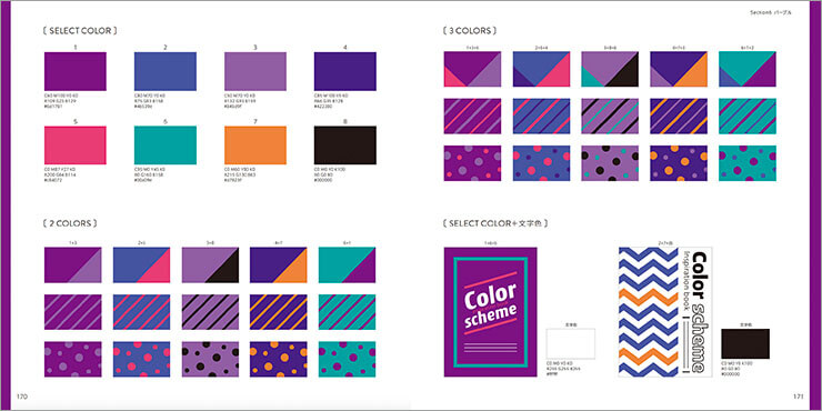 小難しい説明や注釈はない。使用された色の面積バランスをしっかり見せ、使用色にはCMYK、RGB、カラーコードがつく。Webデザインやグラフィックデザインの参考になるよう意識された作例、文字やドットをのせたカラーパターンなどが見開きで完結している。