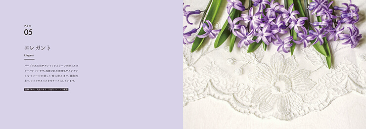 「ありがとうのブーケ」「精霊が住む森」などテーマとなるイメージワードは全体的にロマンチック。パート毎のトビラに使用される写真もおしゃれ。また地味な印象の配色ページのあとに、華やかなイメージのページを並べるなど飽きさせない。