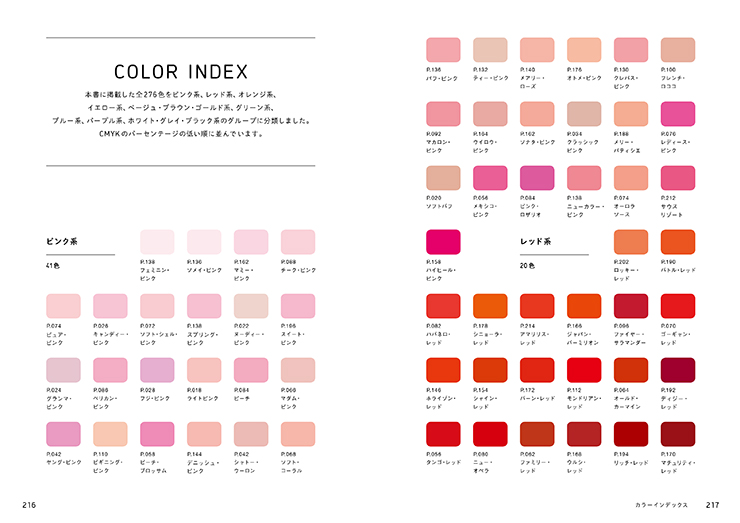 さらに配色のサンプル9色のチョイスにちょっとした工夫がある。一般的にイメージに対して共感できる色はだいたい決まっている。例えば「春」なら桜などを連想させる淡いピンク、緑が普通。本書も6~7色くらいまではそうした一般色なのだが、残りの2~3色が抑えたパープルやブルーなど、あまりそのイメージでは見かけない色が、ほどよく上品さを加える形で登場している。どのイメージワードでも同様のチョイスで、このちょっとした上品さが全体を通して「キレイ」の印象を生んでいるのだろう。