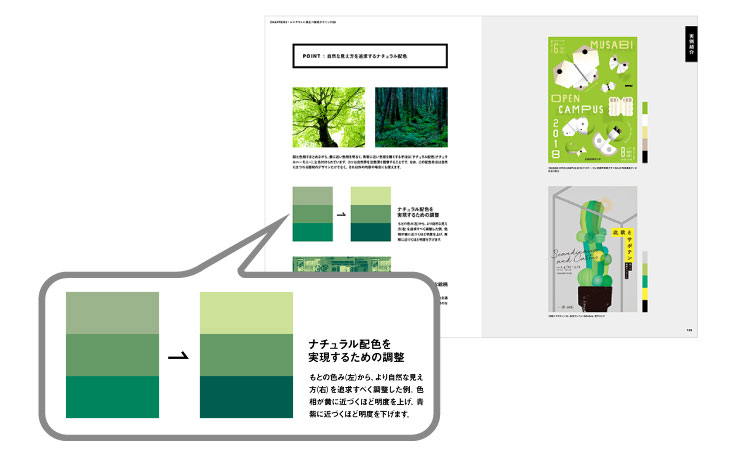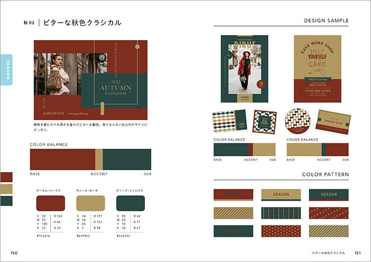 またこのシリーズ全体で共通した工夫がある。同じデザイン、同じ色ベースで、1色プラスされるのとされないのではデザインのイメージが変わる。その違いがわかるように作例を見せているのだ。目立たない手法だが他の配色本ではあまり見かけない。サンプルとしてわかりやすさを考えた作りになっている。