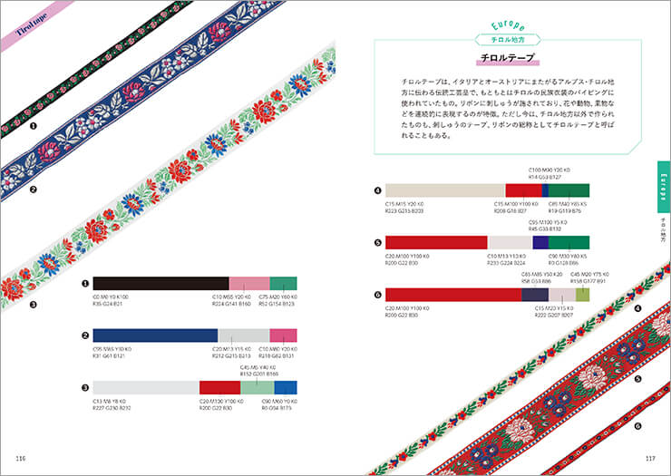 デザインは、アフリカ・ヨーロッパ・東アジアなど5地域、その中を各国で分類。また各テキスタイルに色がわかる配色バー(配色面積帯グラフ)が付き、この色使いをベースにした2色配色、3色配色も作例パターンで紹介する。これがなかなかおもしろい。