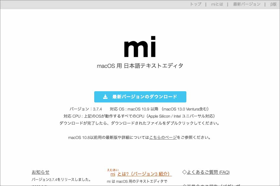 miは、日本人エンジニアのDaisuke Kamiyama氏によって開発された国産のテキストエディタです。旧名はミミカキエディットで、1990年代からMacユーザーに愛用されています。シンプルで軽量なエディタですが、一方でライブラリも多数用意されており、ユーザーの利用目的に合わせてカスタマイズすることも可能です。