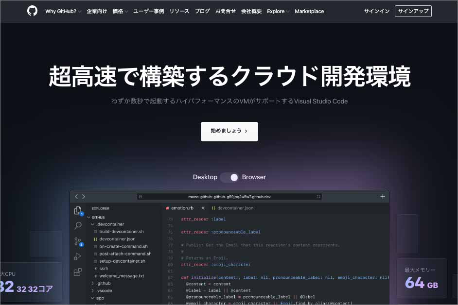 Webサイト:https://github.co.jp/features/codespaces