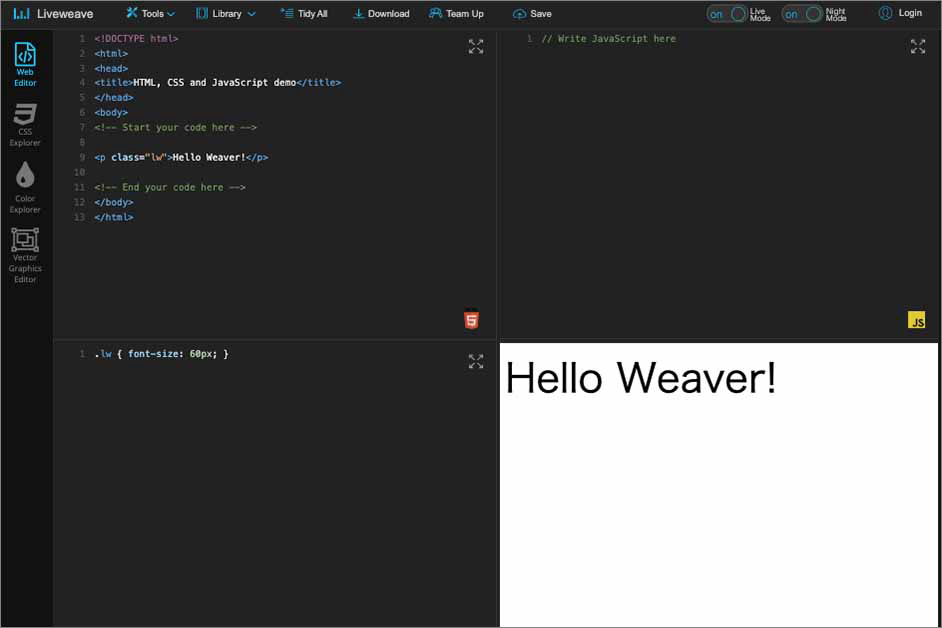 Liveweaveは、Webブラウザで動くSaaSのテキストエディタです。利用環境を選ばないので、例えば小規模企業でPC環境も十分でないクライアント先を訪問している際に、一時的な対応としてコードを修正しなければいけなくなったというケースにも対応できます。分割された画面で、リアルタイムにコード編集の結果を確認できるので、コーダーを目指す人にもおすすめのエディタです。