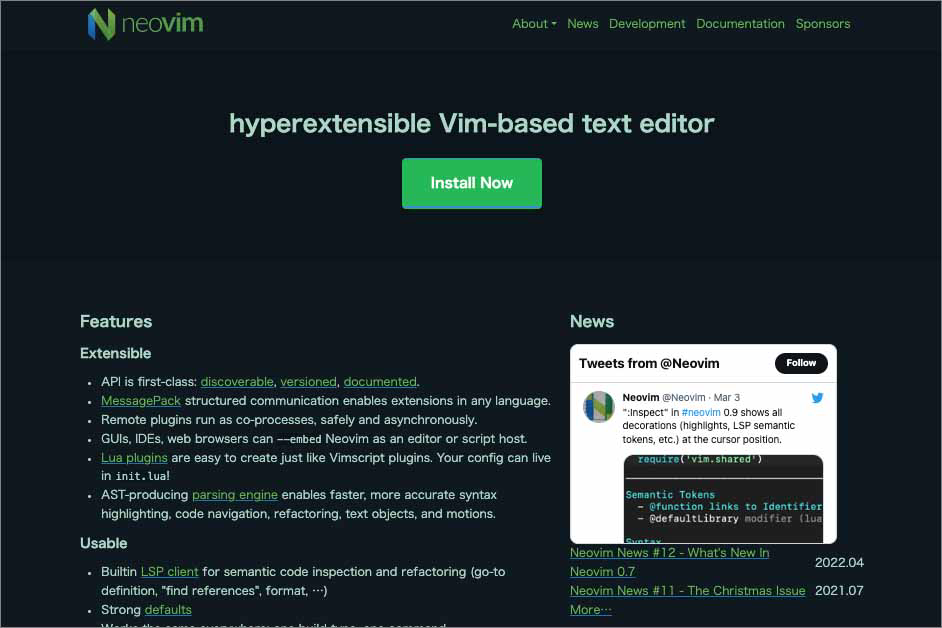 Neovimは、Vimの良い部分は引き継ぎつつ拡張性と使い勝手の良さを高めたVimの後継となるエディタです。比較的新しい技術や言語にも対応した標準搭載されており、UIもモダンなものに刷新されていますので、これからVimを利用したい人にはNeovimのほうがおすすめかもしれません。