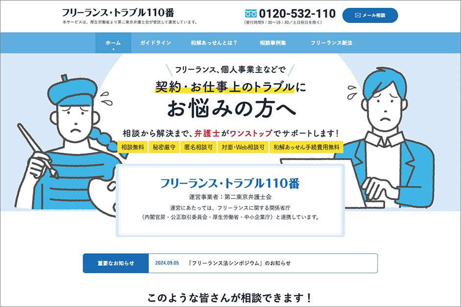 公正取引委員会の特設サイトでは、トラブルが発生した際の相談窓口は「フリーランス・トラブル110番」であると案内されています。
