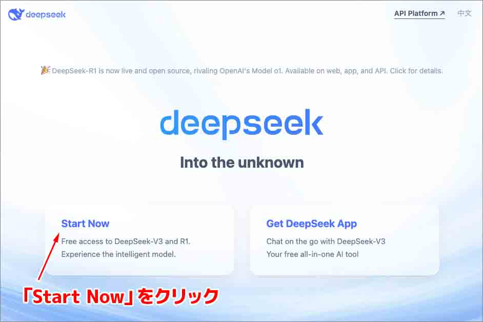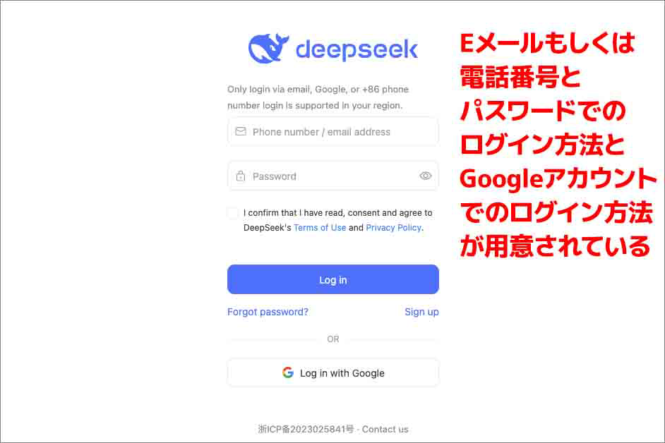 まず、DeepSeekの公式サイトへアクセスします。TOPページにある「Start Now」という項目をクリックすると、アカウント作成・ログイン画面に切り替わります。新規アカウント作成は、Eメールもしくは電話番号とパスワードでログイン設定する方法と、Googleアカウントを利用してログインする方法があります。電話番号でログインするのは少し不安を感じたので、ここではあまり使ってないGoogleアカウントを使ってログインしてみることにしました。