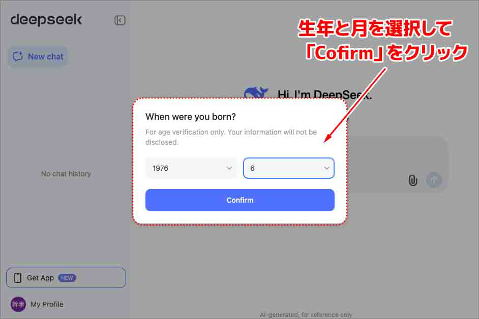 アカウント作成とログインは簡単で、アカウント作成の最後のステップで、生年と月を入力するモーダルウィンドウが開くので生年月を設定して「Confirm」というボタンをクリックします。プロンプト入力画面が表示されたら、アカウント作成は完了です。