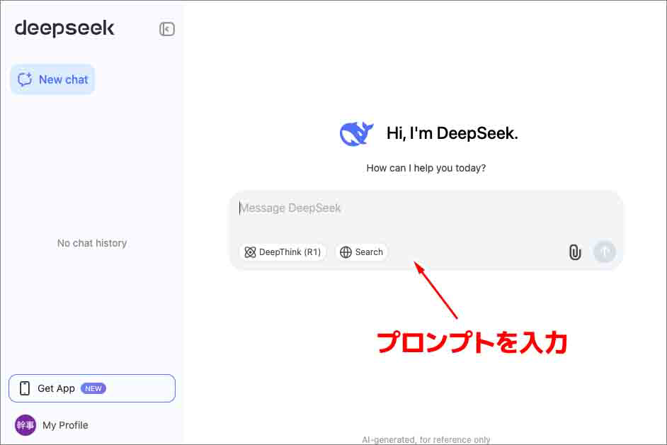 DeepSeekは、プロンプト入力欄の下部にあるボタンで、モデルを切り替えることができます。DeepThink(R1)は、より深い分析が可能なモデルです。ボタンをONにした状態で、送信ボタンを押すとDeepThink(R1)による回答が出力されます。DeepThink(R1)にすると、回答の出力も時間がかかるようです。