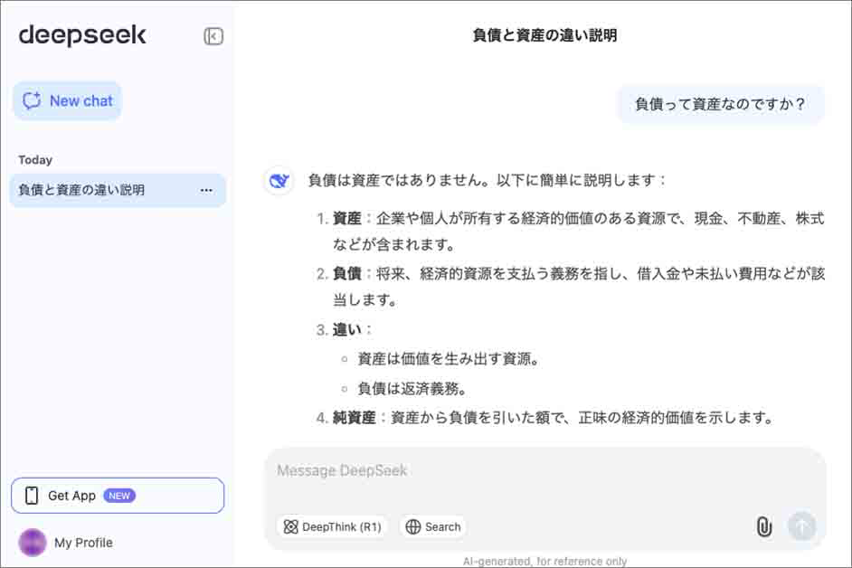 同様の質問をGeminiにしてみましたが「負債は会計上、資産とは区別されます。しかし、経営や財務の視点からは、負債が資産形成や事業成長に貢献する場合もあり、その意味で『資産』と捉えることもできます。」という回答が出力されました。「負債は資産なの?」といった疑問を持つといった状況は、会計業務や簿記の学習といったような想定は十分に可能ですので、この質問に関してはDeepSeekの回答はやや精度が低いように感じました。