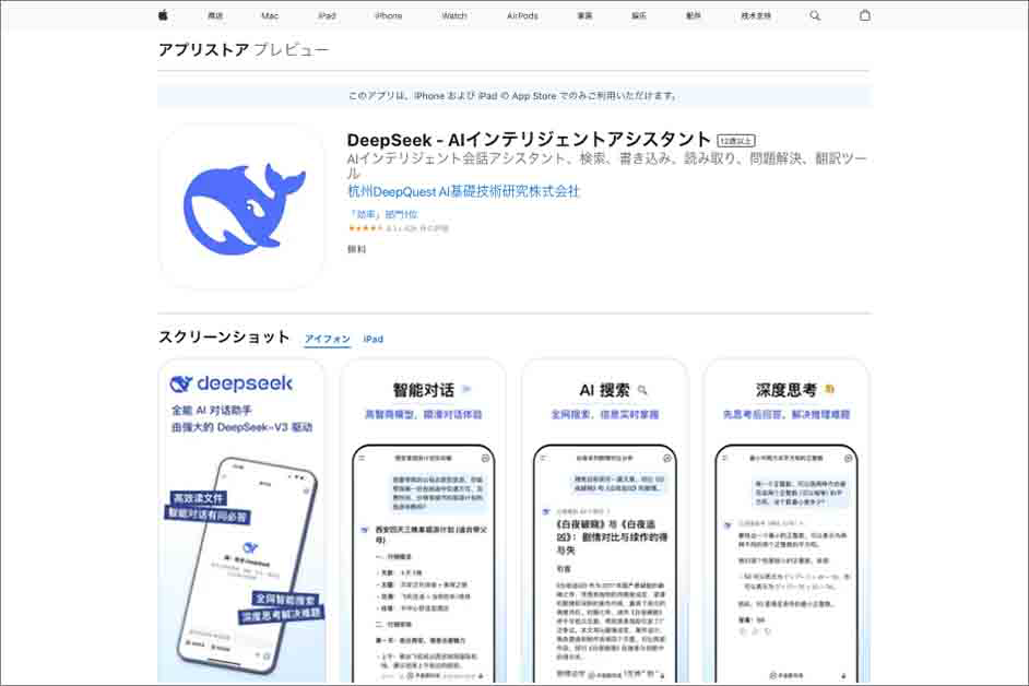 DeepSeekは、iOS版のアプリも提供しています。Android版については、現在のところ提供されていないようです。