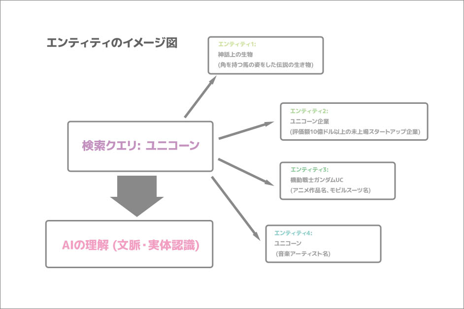 また、クエリファンアウトが主にテキスト情報を扱うのに対し、エンティティはマルチモーダル検索(画像、音声、動画などを含む検索機能強化)の進化により、ビジュアルコンテンツに対しても大きな影響力を持っています。今まではalt属性やファイル名といったテキスト情報に頼るしかなかったイラストや写真なども、AIによるエンティティ認識の進化によって、コンテンツ内のビジュアル要素(例:イラスト内の猫、人物、スタイルなど)を直接理解し、関連するテキスト情報や作品を制作したクリエイターのプロフィール情報などと結びつけて一つの実体として捉えることが可能になります。加えて、エンティティはデザインに関しても理解を深めます。例えば、ユーザーが「フラットデザインのWebサイト」や「和モダンのデザインのWebサイト」の成功事例を知りたいと検索した場合、AIはこれらのデザインスタイルをエンティティとして理解し、関連するWebサイトやコンテンツを提示します。これは、人間が視覚情報とテキスト情報をシームレスに結びつけるように、AI検索エンジンがより深くコンテンツを理解できるようになったことを意味し、次世代のSEOに大きな影響を与えています。