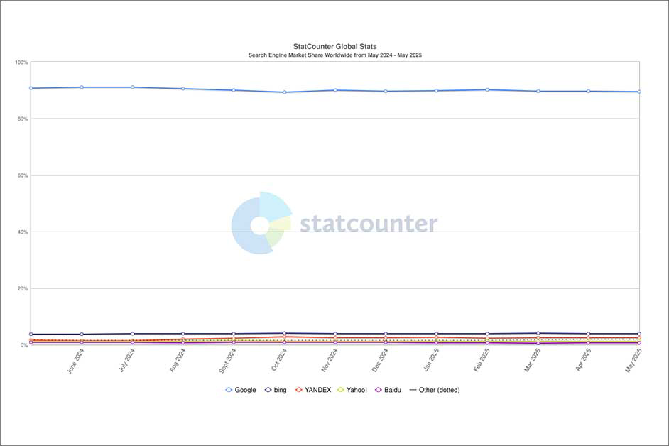 ChatGPT(OpenAI)、Bing AI(Microsoft)、Perplexity AIなどがAI検索市場に参入し、競争が激化しています。しかし、2025年5月時点のStatCounter Global Statsによると、全世界の検索エンジンシェアはGoogleが約90%、Bingが約4%となっており、日本国内でも同様の傾向が続いています。MicrosoftのCopilotやChatGPTの登場によってBingが一時的に注目を集めましたが、依然としてGoogleとのシェアの差は圧倒的です。「検索=Google」という根強いユーザー習慣を動かすのは容易ではないことが、こうしたデータからも明らかです。